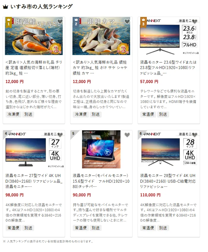 いすみ市で人気の返礼品は、塩銀鮭切り落としです。約3kgの大容量で、チリ産銀鮭を塩加工した切り落としは食卓で使いやすいと好評です。他には脂のり豊かな銀鮭カマ約3kg、フルHD対応の液晶モニター23.6型、4K UHD対応の27型モニターも選ばれています。寄付金は、里山や海辺の自然環境の保全や、学校施設の整備や学習環境の充実に活用されています。