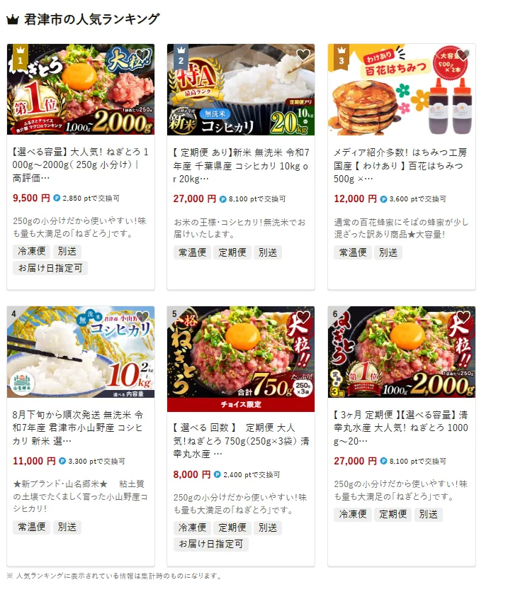 君津市で人気の返礼品は、「【選べる容量】大人気!ねぎとろ 1000g~2000g(250g小分け)」です。250gごとの便利な小分けで、手巻き寿司や丼に活用しやすく、ご家庭で本格的な味わいが楽しめます。他には、「【定期便あり】新米 無洗米 令和7年産 千葉県産 コシヒカリ 10kg」や、国産はちみつ 百花はちみつ500g×2本も好評です。寄付金は、森林や水資源の保全をはじめ、教育・子育て支援など地域の未来づくりに活用されています。
