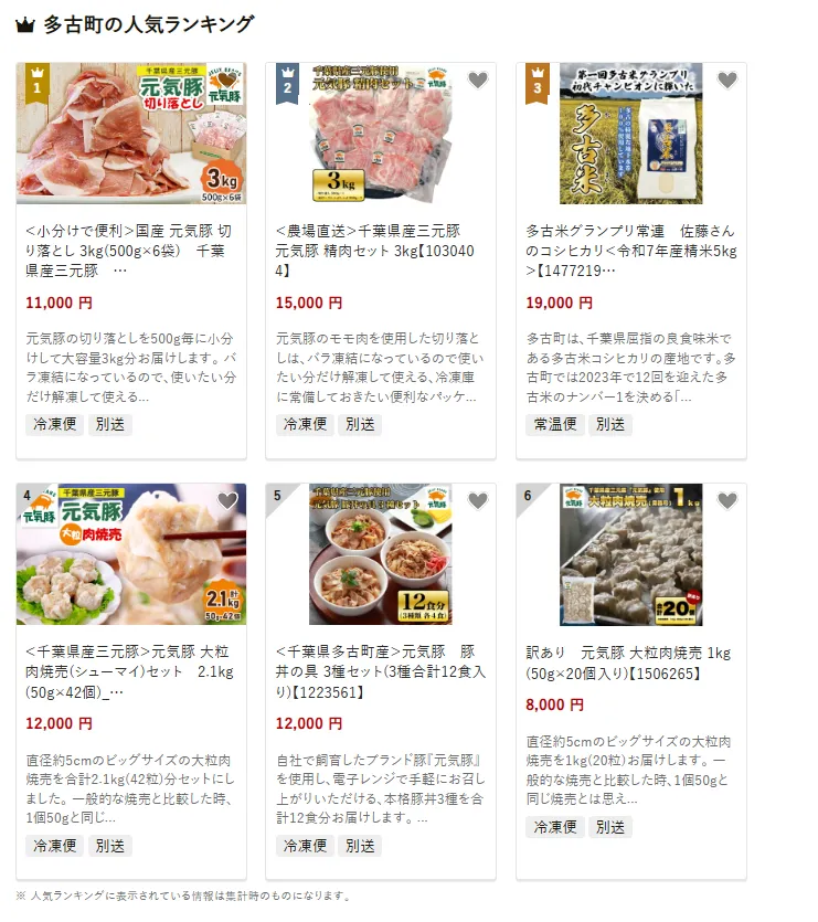 多古町で人気の返礼品は、「国産三元豚切り落とし3kg(500g×6袋)」です。小分けで便利なパックは使い勝手が良く、冷凍保存も可能です。他には、「千葉県産三元豚 精肉セット3kg」や、多古米グランプリ常連の「令和7年産多古米5kg」も人気です。寄付金は、農業の担い手育成やブランド米の振興に加え、子育てや地域福祉の充実に活用されています。