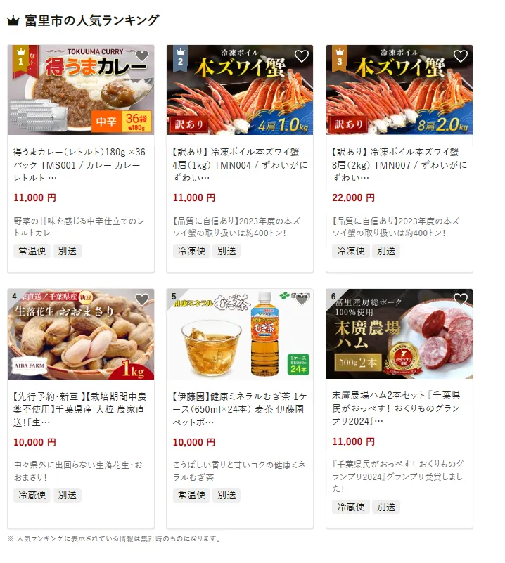 富里市で人気の返礼品は、「得うまカレー(レトルト)180g×36パック」です。野菜の旨味とスパイスが効いたカレーは、保存性も高く日常使いに最適です。他には、「訳あり冷凍ボイル本ズワイ蟹」や「末廣農場ハム2本セット」も好評です。寄付金は、農業振興や地域産業の発展に加え、防災・安全対策や教育環境整備に役立てられています。
