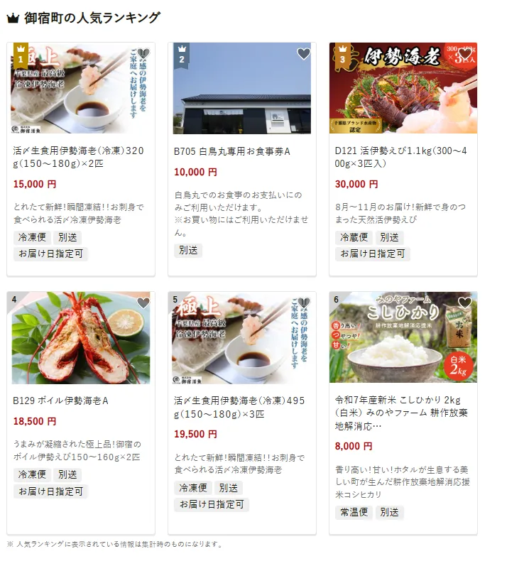 御宿町で人気の返礼品は、「活〆生食用 伊勢海老(冷凍)320g(150~180g×2匹)」です。鮮度抜群の伊勢海老は、お刺身はもちろん、味噌汁や焼き物でも絶品と評判です。他には、「B705 白鳥丸専用や食事券A」や、「D121 活伊勢えび1.1kg(300~400g×3匹入)」なども人気です。寄付金は、海の安全対策や観光資源の保護に加え、教育環境の整備など地域の活性化に活用されています。