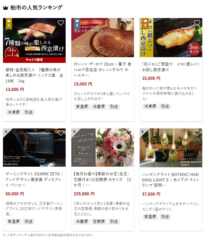 柏市で人気の返礼品は、「銀鱈・金目鯛入り 7種類の味が楽しめる西京漬けミックス 1kg」です。定番から贅沢な魚までそろい、食卓を彩ります。他には、食べログ百名店「ガレット・デ・ロワ ホールケーキ」や「メロ銀ムツお試し西京漬け」も人気です。寄付金は、子育て支援や教育環境の整備に加え、文化・スポーツ振興など市民が豊かに暮らせる取り組みに活用されています。
