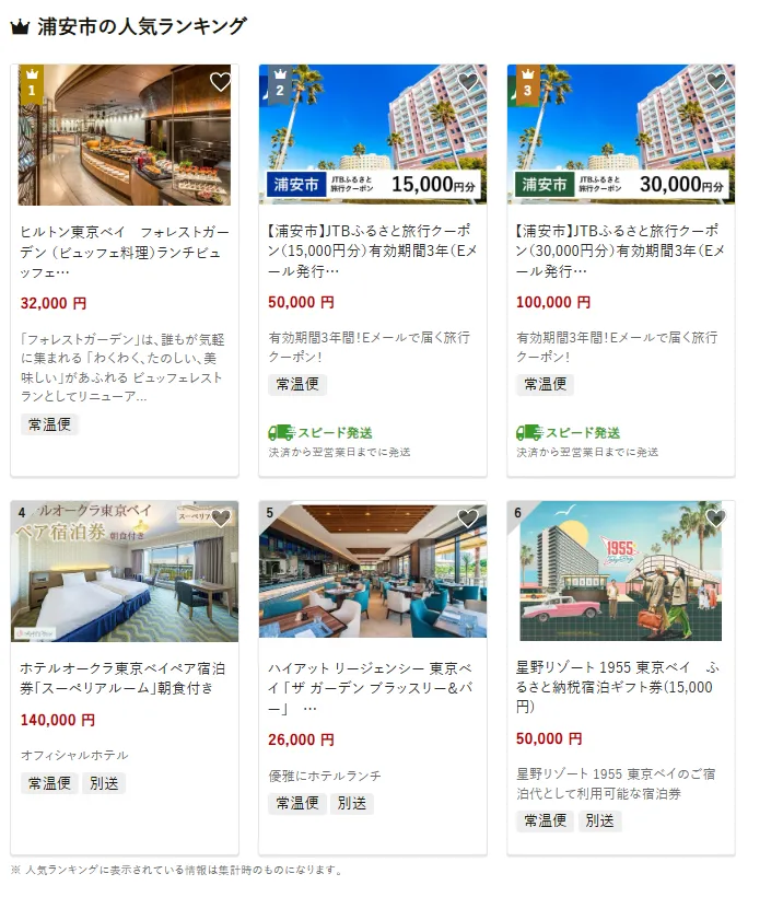 浦安市で人気の返礼品は、「ヒルトン東京ベイ フォレストガーデン(ビュッフェ料理)ランチビュッフェ ペア食事券」です。和洋中が揃う多彩なメニューを心ゆくまで楽しめる人気のプランです。他には、「浦安市JTBふるさと旅行クーポン(15,000円分・有効期間3年)」や、「オリエンタルホテル東京ベイ ペア宿泊券(スーペリアルーム・朝食付き)」なども選ばれています。寄付金は、海辺の景観保護や環境対策、子どもたちの健やかな学びを支える教育分野の施策に活用されています。