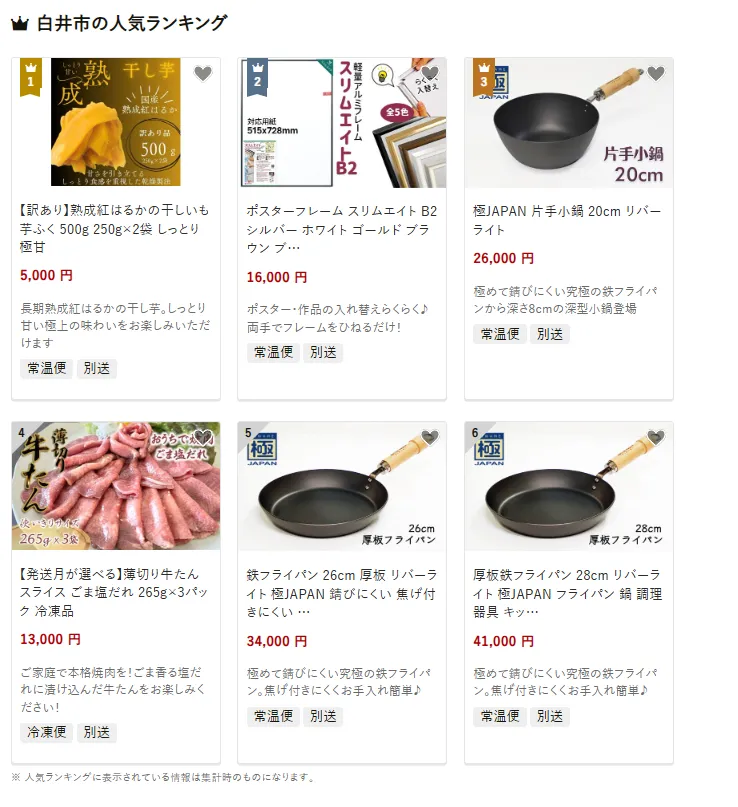 白井市で人気の返礼品は、「訳あり熟成紅はるかの干しいも 500g×2袋」です。しっとり甘い干しいもは健康的なおやつとして親しまれています。他には、「ポスターフレーム スリムエイトB2」や「極JAPAN 片手小鍋20cm」も選ばれています。寄付金は、子育てや福祉事業の充実に加え、防災や地域の安全対策など住民の安心を支える取り組みに活用されています。