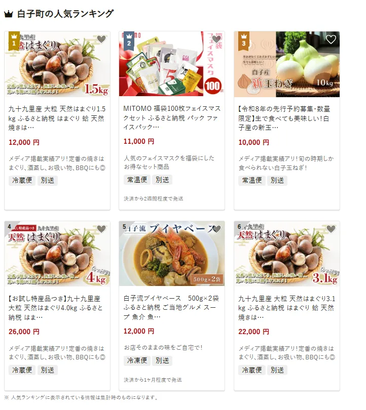 白子町で人気の返礼品は、「九十九里産 大粒 天然はまぐり1.5kg」。プリッとした身が特徴で、酒蒸しやBBQに最適です。他には、「白子流ブイヤベース 500g×2袋」や「白子産 新玉ねぎ10kg」も好評です。寄付金は、漁業や農業の振興、観光資源の活用に加え、教育や地域福祉の充実といった取り組みに活用されています。