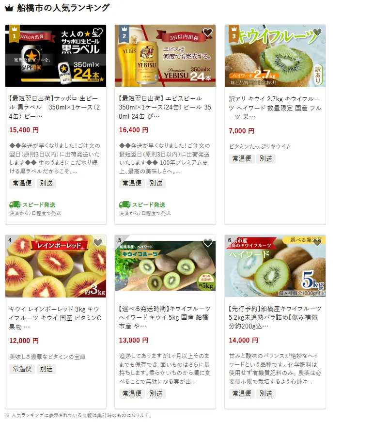 船橋市で人気の返礼品は、「サッポロ生ビール黒ラベル 350ml×1ケース(24缶)」です。大人の味わいを楽しめる黒ラベルは、家庭用にも贈答用にも喜ばれる一品です。他には、「エビスビール350ml×24缶」や、ビタミン豊富な「訳ありキウイフルーツ2.7kg」も人気です。寄付金は、都市基盤整備や交通利便性の向上に加え、子育てや福祉分野での支援に活用されています。