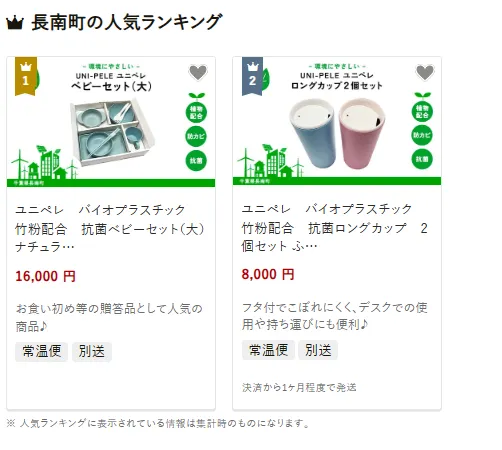長南町で人気の返礼品は、「ユニペレ バイオプラスチック竹粉配合 抗菌ベビーセット(大)」です。環境に優しい素材を使用した実用性の高いセットは、贈り物にも最適です。他には、「ユニペレ バイオプラスチック竹粉配合 抗菌ロングカップ2個セット」や、「ゴルフ場利用券」も好評です。寄付金は、環境保全や地域資源の有効活用に加え、子育てや教育支援に活用されています。