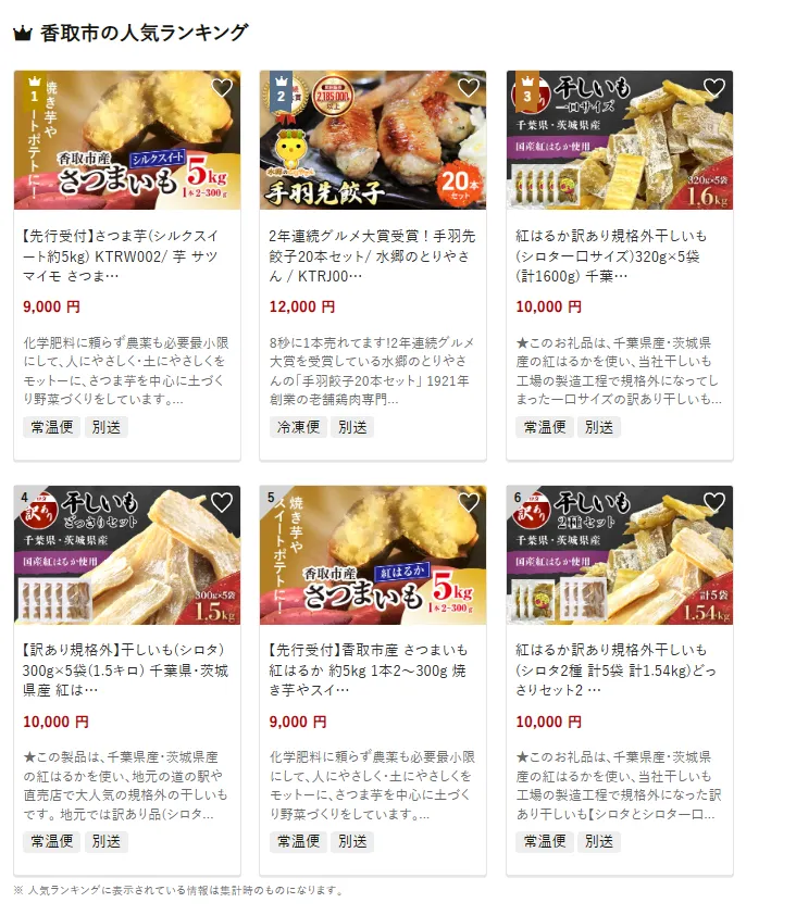 香取市で人気の返礼品は、「【先行受付】さつま芋(シルクスイート約5kg)KTRW002」です。しっとりとした食感と上品な甘さが特徴で、焼き芋やスイーツづくりに最適です。他には、手羽先餃子20本セットや、訳あり規格外干しいも(シロターロサイス)1.6kgも人気を集めています。寄付金は、農産物の振興や観光交流に加え、福祉や子育て支援など住民生活を支える取り組みに活用されています。