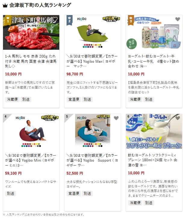 会津坂下町で人気の返礼品は名物の「会津馬刺し(モモ赤身)」です。鮮度抜群の状態で冷蔵便にて届けられ、特製のたれとともにご家庭で本場の味を楽しめます。他にも全国的に人気のリラックスアイテム「Yogibo Max」や、牛乳・コーヒー牛乳・ヨーグルト・飲むヨーグルトの詰め合わせ「べこの乳&ヨーグルトセット」が人気です。