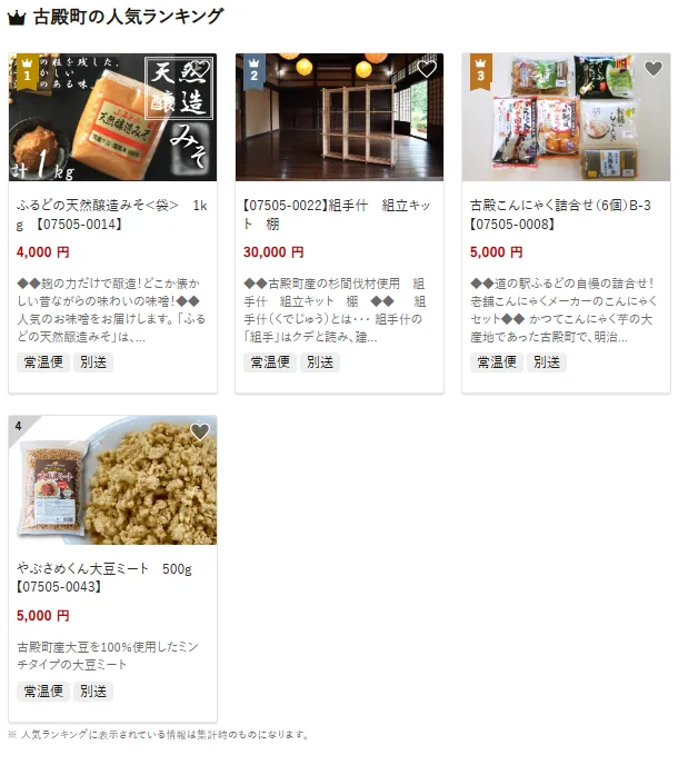 古殿町で人気の返礼品は「ふるどの天然醸造みそ」です。1kg袋入りで、昔ながらの製法で作られた風味豊かな味噌として好評です。他にも手作り感あふれる「組手什 組立キット 棚」や、こんにゃく6個入りの詰合せも人気があります。