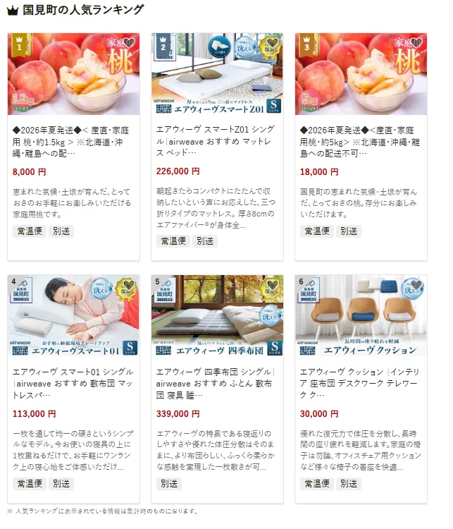 国見町で人気の返礼品は、地元の恵まれた気候と土壌が育んだ桃です。家庭用の桃は約1.5kgや5kgで届き、甘みとジューシーさを存分に楽しめると好評です。他にも快眠をサポートする「エアウィーヴ スマートZ01 シングル」も注目されています。