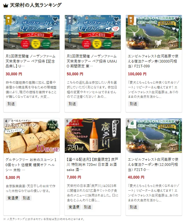 天栄村で人気の返礼品は、月1回限定で開催される「ノーザンファーム天栄見学ツアー」です。競馬ファンにはたまらない、東北屈指の競走馬生産地を間近に見学できるツアーは、記念品なしながらも特別な体験として好評です。他にもエンゼルフォレスト白河高原で使える3万円相当の宿泊クーポンも人気を集めています。