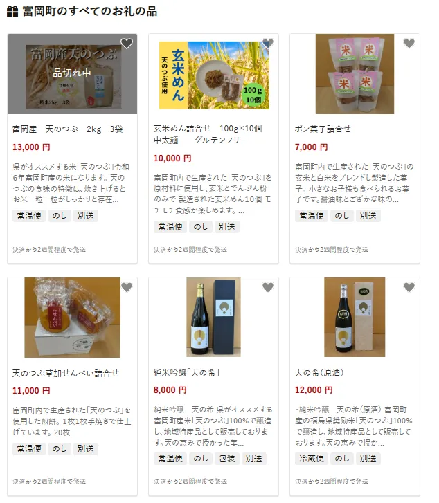 富岡町で人気の返礼品は地元産米「天のつぶ」2kgが3袋セットです。ふっくらとした食感と甘みが特長で、家庭での食卓にぴったりです。他にもグルテンフリーの玄米めん詰合せ(100g×10個)や、香ばしいポン菓子の詰合せも好評です。