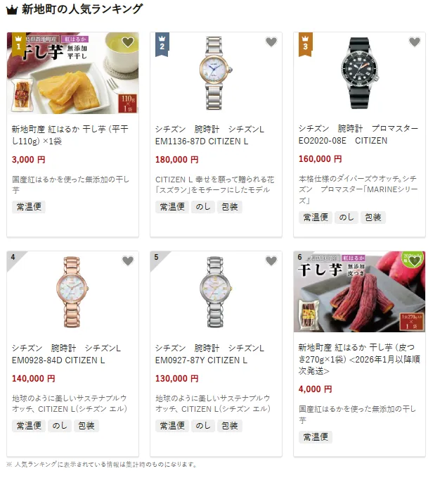 新地町で人気の返礼品は、国産紅はるかを使用した無添加の干し芋です。平干し110gの袋入りで、素材本来の甘さと風味が楽しめると好評です。他にもスズランをモチーフにしたデザインのシチズンの腕時計「CITIZEN L」や本格仕様のダイバーズウォッチの「プロマスター MARINEシリーズ」が注目を集めています。
