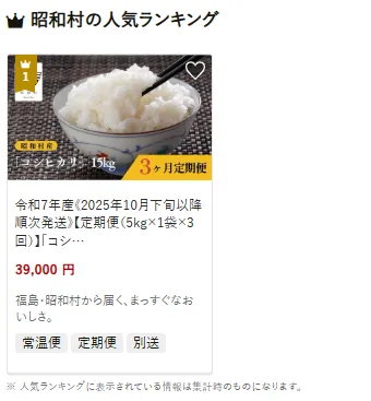 昭和村で人気の返礼品は昭和村産の「コシヒカリ定期便」です。令和7年産の米が、5kg×1袋×3回(合計15kg)で届き、おいしさと品質の高さが家庭でも楽しめると好評です。