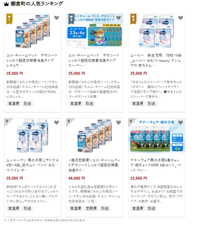 棚倉町で人気の返礼品は家庭で便利に使える「ユニ・チャームペット デオシート」です。しっかり超吸収で無香・消臭タイプのペットシーツは、レギュラーサイズ448枚やスーパーワイド92枚の大容量セットで届きます。他にも新生児用「ムーニーおむつ 76枚×4袋」も好評です。