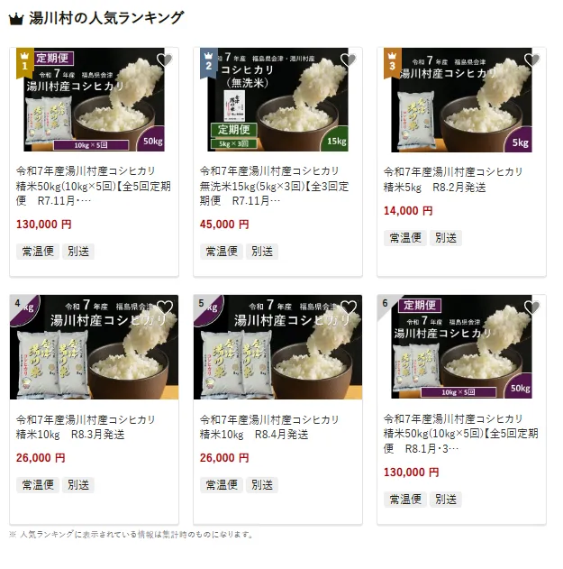 湯川村で人気の返礼品は地元産の「湯川村産コシヒカリ」です。定期便で届く精米50kg(10kg×5回)や無洗米15kg(5kg×3回)、精米5kgなど、用途や家庭の消費量に合わせて選べるのが魅力です。ふっくらと炊き上がるお米は、毎日の食卓で地元の味を楽しめると好評です。