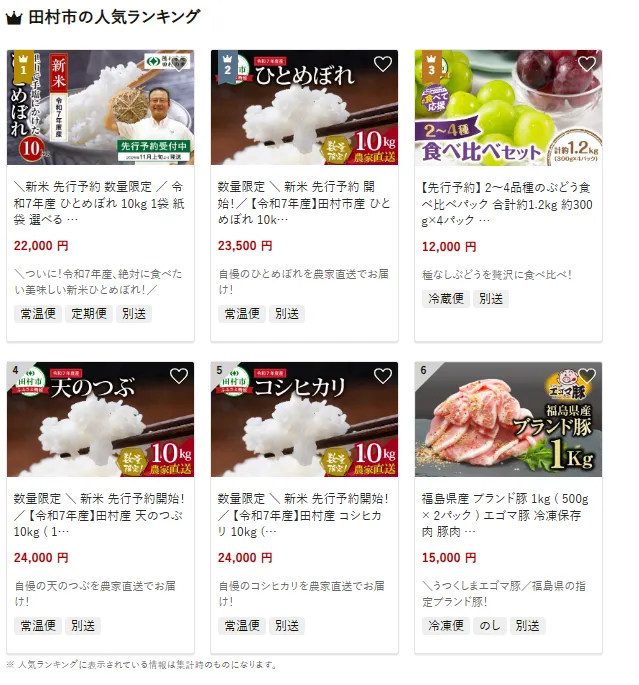 田村市で人気の返礼品は令和7年産の「ひとめぼれ」10kgです。農家直送で精米したての新米が届き、ふっくらと炊き上がるお米として好評です。他にも、2~4品種のぶどう食べ比べパック(合計約1.2kg)がシャインマスカットやピオーネなど贅沢に味わえると人気を集めています。