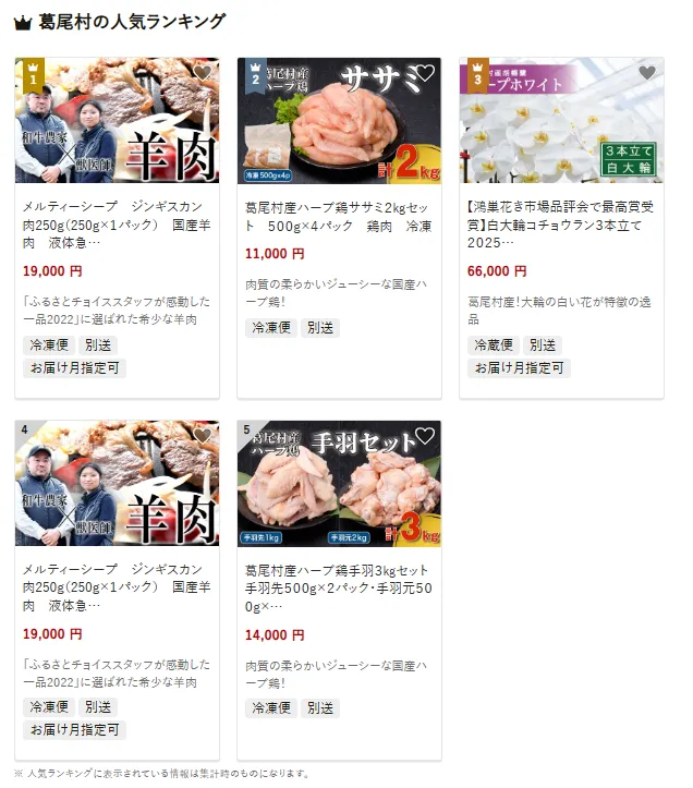 葛尾村で人気の返礼品は「メルティーシープ ジンギスカン肉 250g」です。希少な国産羊肉を液体急速冷凍で届けるため、家庭でもジューシーで風味豊かな味わいを楽しめると好評です。他にも肉質が柔らかくジューシーな「葛尾村産ハーブ鶏ササミ 2kgセット」や、鴻巣花き市場品評会で最高賞を受賞した「白大輪コチョウラン 3本立て」も人気です。