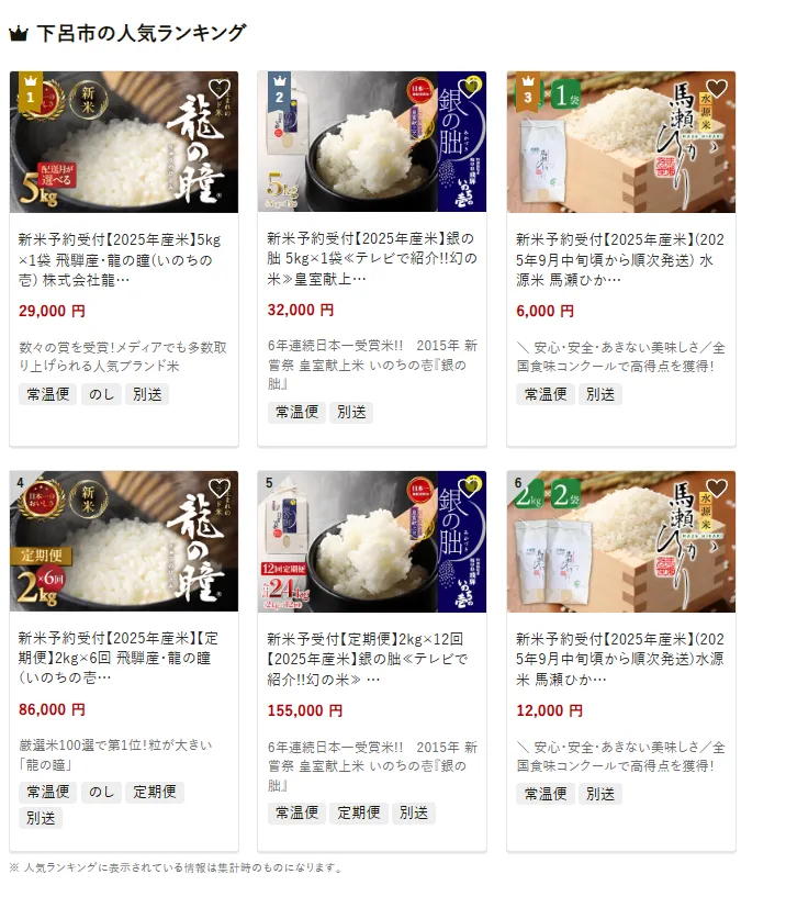 下呂市で人気の返礼品は、「飛騨産 龍の瞳 新米」15kgです。大粒で甘みが強く、全国的にも高評価のお米です。他には銀の朏や馬瀬ひかりといったブランド米も人気です。寄付金は、子育てや教育環境の充実、そして下呂温泉を中心とした観光資源の保護・発展に活用されています。
