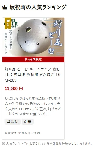 坂祝町で人気の返礼品は、「灯り瓦 どーむ ルームランプ」です。瓦を使った温もりあるデザインで、やさしい光が暮らしを彩ります。他には地元農産物を使った返礼品も揃っています。寄付金は、学校教育や保育体制の充実、高齢者や障がい者福祉の推進、地場農産物のブランド化支援に活用されています。