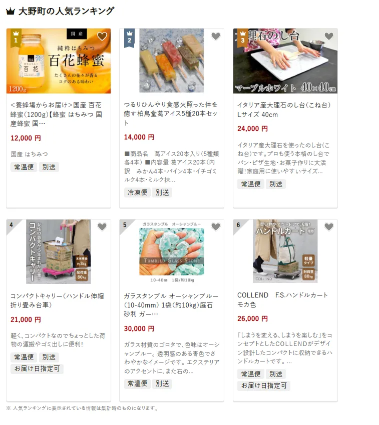 大野町で人気の返礼品は、「国産百花蜂蜜(1200g)」です。豊かな自然で採れた蜂蜜は、濃厚でコクのある味わいが楽しめ、パンや料理にもぴったりです。他には、見た目も華やかな「アイスキャンディー20本セット」や、プロ仕様の「イタリア産大理石のこね台」など、バラエティ豊かな品が揃います。寄付金は、地域の農業振興や暮らしやすい環境づくりに活用されています。
