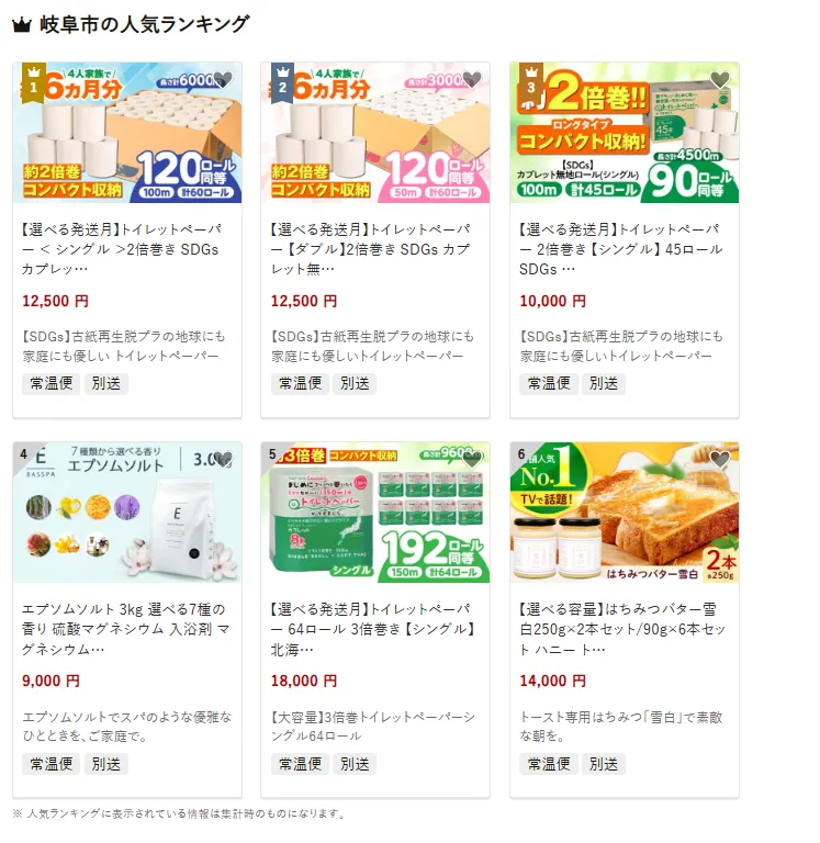 岐阜市で人気の返礼品は、「選べるトイレットペーパー ダブル12倍巻きSDGs 120ロール」です。古紙再生の環境に優しい仕様で、日常生活に便利です。他にはエプソムソルト入浴剤やはちみつバター雪白食パンも人気。寄付金は、子育てや教育環境の整備、また地域医療や高齢者福祉の推進に活用されています。