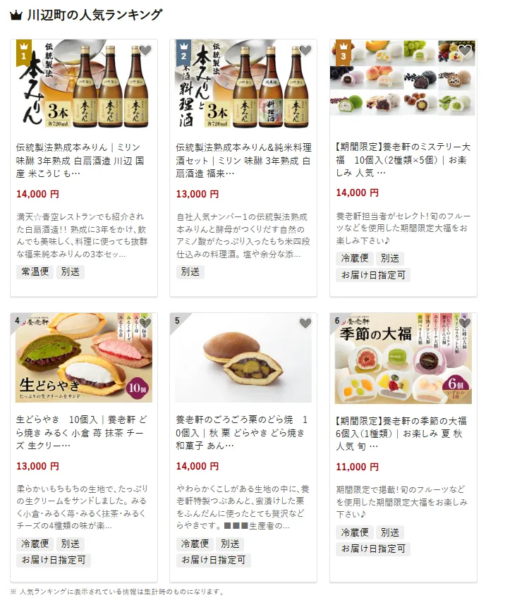 川辺町で人気の返礼品は、「伝統製法 熟成本みりん3本セット」です。料理に深みを与える逸品です。他には純米料理酒や養老軒のフルーツ大福・どら焼きなど和菓子も人気。寄付金は、子育てや教育支援、医療や福祉の充実、また町並みや自然環境の保護に活用されています。