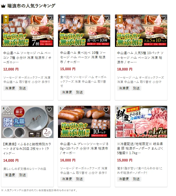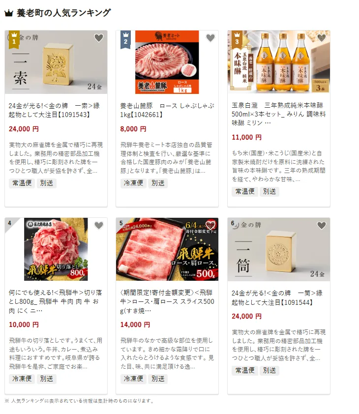 他には、「養老山麓豚 ロースしゃぶしゃぶ用 1kg」や「飛騨牛切り落とし 800g」「飛騨牛ロース・肩ローススライス500g」など、豚肉・牛肉の名産品も好評。さらに「玉泉白瀧 三年熟成本味醂セット」などの伝統の調味料も選ばれています。