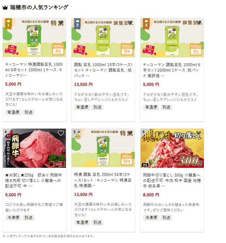 瑞穂市で人気の返礼品は、「キッコーマン特濃調製豆乳1000ml 6本セット」です。クセの少ない豆乳で健康志向の方に最適。他には飛騨牛切り落としや特濃豆乳200mlパックなども人気です。寄付金は、子育て支援や教育の充実、地域医療や高齢者福祉、安心して暮らせるまちづくりに活用されています。