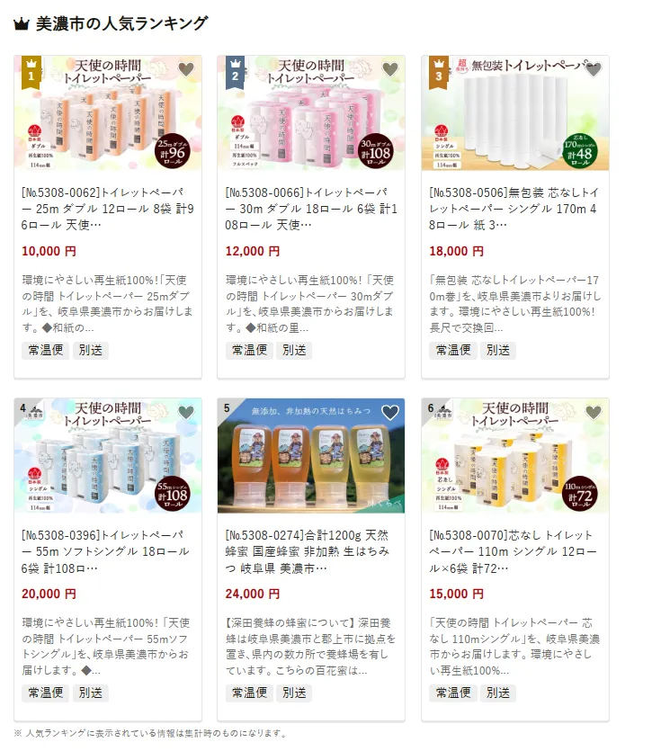 美濃市で人気の返礼品は、「天使の時間 トイレットペーパー12ロール×8袋セット」です。環境に配慮した再生紙使用が特徴です。他には無香料シングルロールや地元産はちみつも人気。寄付金は、和紙をはじめとした伝統工芸の振興、教育や子育て支援、地域福祉の充実に活用されています。