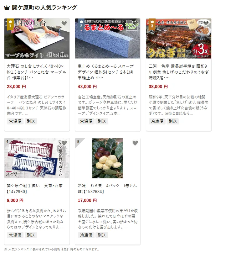 関ケ原町で人気の返礼品は、「大理石の台 40×40cm マーブルホワイト」です。調理やパンづくりに便利な高品質の天然石です。他にはスロープ用車止め石や長焼きうなぎ蒲焼も人気です。寄付金は、子育て・教育支援や地域医療の充実、関ケ原合戦跡の保存と観光振興に活用されています。