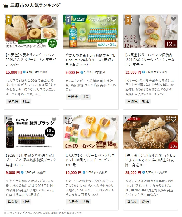 三原市で人気の返礼品は、ふわふわでクリーミーな味わいが魅力の「八天堂」のスイーツパンセットです。訳ありお得セットや定番のクリームパン詰合せがご家庭で手軽に楽しめます。他にも爽健美茶のやかんの麦茶はカフェインゼロで子どもから大人まで安心して飲める人気商品です。