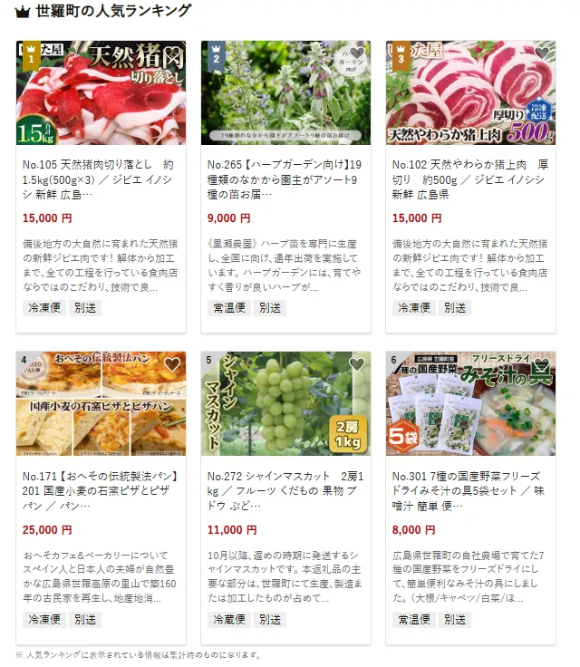 世羅町で人気の返礼品は、広島県産の新鮮な天然猪肉です。切り落とし約1.5kgとやわらかい厚切り約500gが特に好評です。他にもハーブガーデン向けの19種類の中から厳選された9種の苗のアソートセットも人気で、自宅の庭やテラスで気軽に楽しめます。