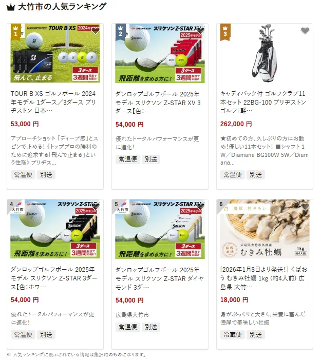 大竹市の人気の返礼品はプロも愛用するスピン性能と風に強い高弾道が特徴の「TOUR B XS ゴルフボール(2024年モデル)」です。他にも、飛距離性能とスピン性能のバランスに優れたモデル「スリクソン Z-STAR XV(2025年モデル)」や初心者から中級者まで幅広く支持されるセット内容の「ブリヂストン キャディバック付き ゴルフクラブ11本セット」も人気を集めています。