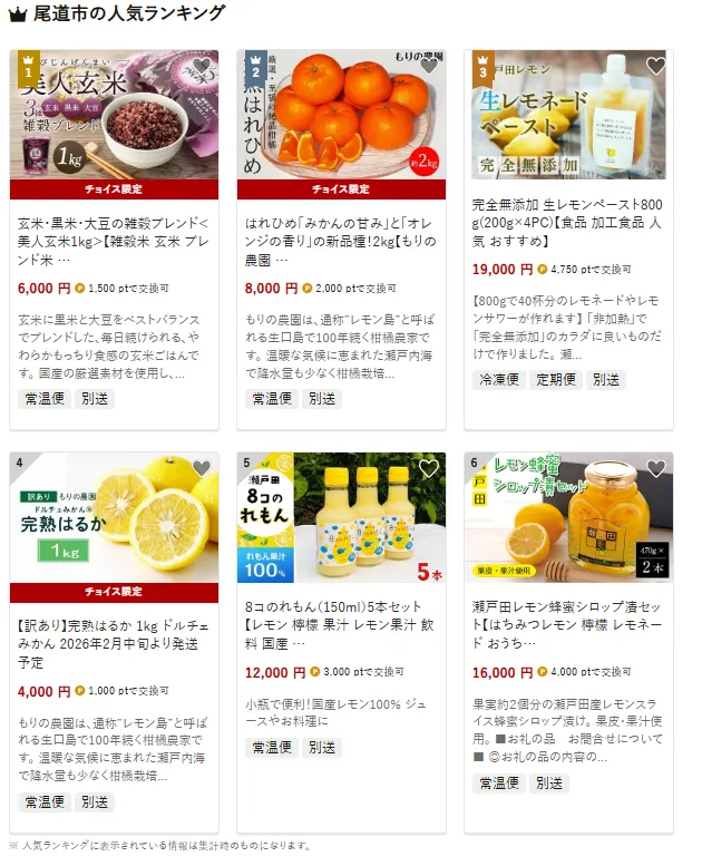 尾道市で人気の返礼品は玄米・黒米・大豆をバランスよくブレンドした雑穀米「美人玄米」です。食物繊維や大豆イソフラボンが豊富。毎日の食事に手軽に取り入れられると好評です。他にも、みかんの甘みとオレンジの香りを併せ持つ「はれひめ」やドリンクや料理にも使える広島産レモンを使った加工品「完全無添加 生レモンペースト」が人気です。