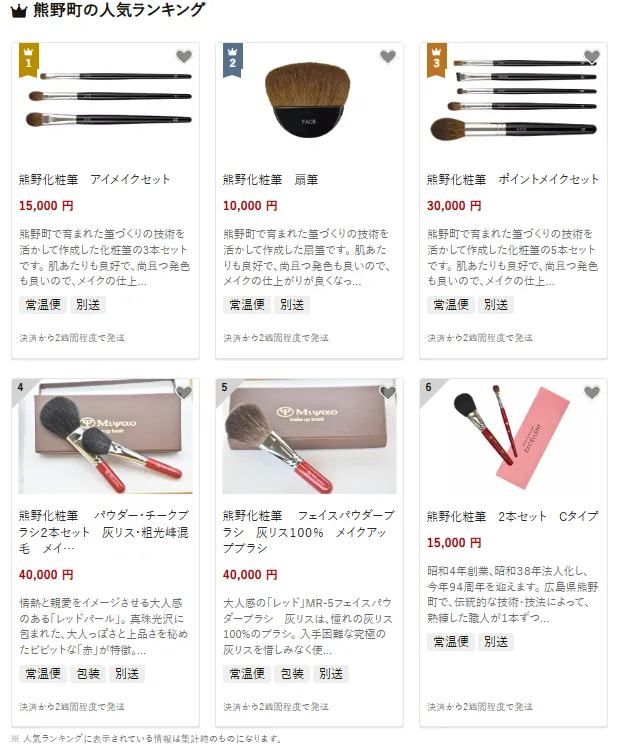 熊野町で人気の返礼品は繊細な目元を美しく仕上げる「熊野化粧筆 アイメイクセット」です。他にもプロのメイクアップアーティストにも支持されている「扇筆」、そしてリップやチークに使いやすい「ポイントメイクセット」も人気です。いずれも職人が一本一本丁寧に仕上げた高品質な化粧筆で、肌あたりのやさしさとメイクの仕上がりのよさをぜひ実感してください。