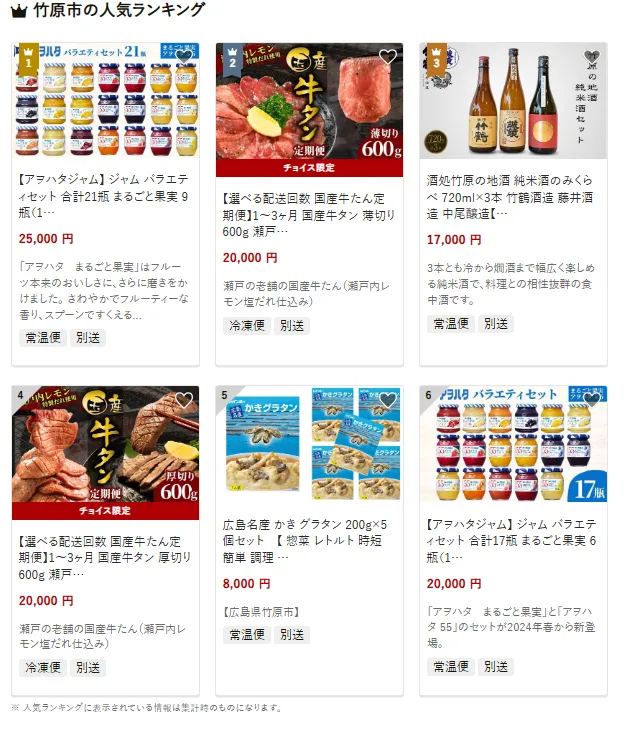竹原市で人気の返礼品は地元産の果実をたっぷり使った「アヲハタジャム」バラエティセット(計21瓶)です。いちごやりんご、マンゴーなど多彩なフルーツの味わいを楽しめます。他にも焼肉やBBQにぴったりの瀬戸内レモン塩だれで味付けした国産牛タンの定期便や、竹鶴酒造をはじめとする酒処竹原の純米酒飲み比べセットも人気です。