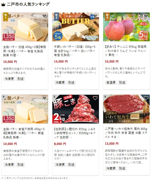 二戸市で人気の返礼品は「全酪バター 加塩」です。業務用サイズで、製菓や料理にたっぷり使える便利なセットです。地域自慢の「牛飼いのバター」はコクがありながらもすっきりとした味わいで、料理やパンのお供にぴったりです。他にも「訳ありサンふじりんご」は見た目に多少難があっても、甘み・酸味・香り・食感のバランスが良く、家庭用におすすめです。