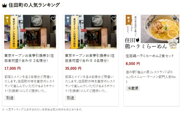 住田町で人気の返礼品は町の特産を使った「東京オーブンお食事引換券」です。住田食材を盛り合わせたコースを都内で味わえるユニークな仕組みで、2名様用・4名様用から選べます。他にも道の駅「種山ヶ原」のレストラン「ぽらん」で人気No.1の「住田鶏ハラミらーめん」も評判で、地元の鶏肉の旨みを活かした一杯を自宅で楽しめます。
