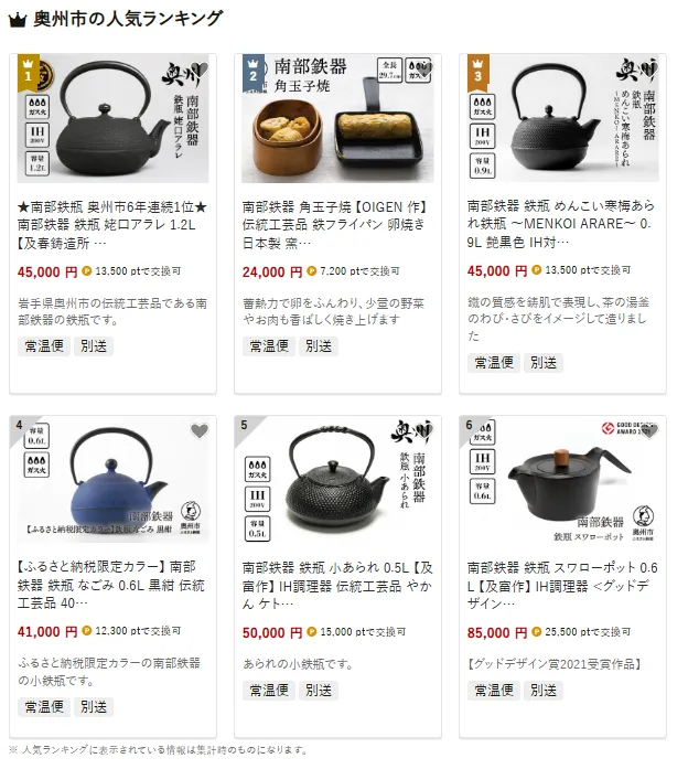 奥州市で人気の返礼品は伝統工芸「南部鉄器」を代表する鉄瓶「姥口アラレ」です。及春鋳造所の職人が丁寧に仕上げた逸品で、長年愛され続けています。他にも熱伝導と蓄熱性に優れ、ふんわり卵焼きが作れる「南部鉄器 角玉子焼」や、茶の湯釜のわび・さびを表現した「めんこい寒梅あられ鉄瓶」が日常使いにも贈答用にも喜ばれています。