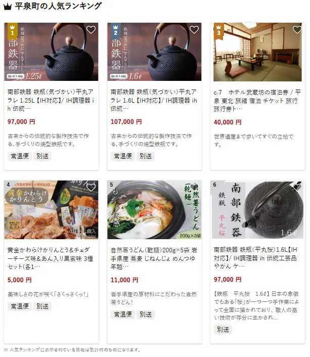 平泉町で人気の返礼品は伝統工芸の技が光る「南部鉄器 鉄瓶」です。職人が古来からの製法で一つひとつ丁寧に仕上げており、IH対応で現代の暮らしにも取り入れやすい逸品として注目されています。他にも、 世界遺産・平泉の観光に便利な「ホテル武蔵坊の宿泊券」も人気です。