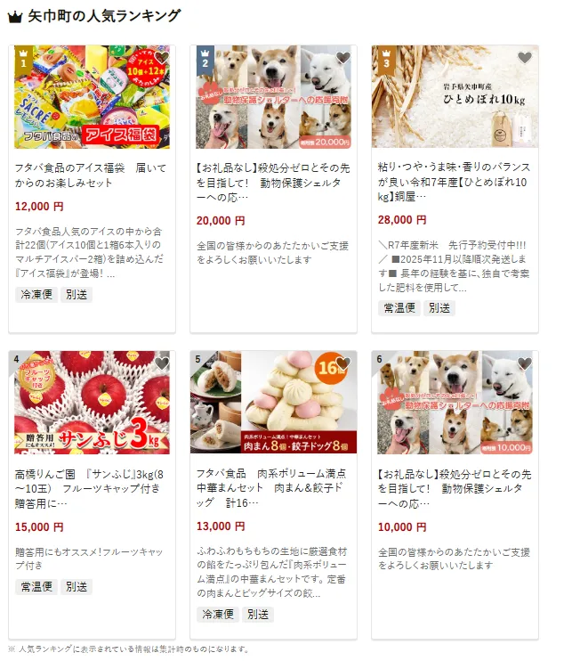 矢巾町で人気の返礼品は届いてからのお楽しみ「フタバ食品のアイス福袋」です。バラエティ豊かなアイスが詰まったセットで、家族みんなで楽しめると評判です。他にも粘りやつや、香りのバランスが良い「令和7年産ひとめぼれ」や、動物保護シェルターを応援できる寄附も用意されています。