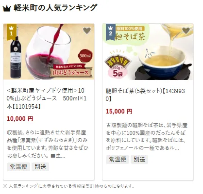 軽米町で人気の返礼品は、町特産のヤマブドウを贅沢に使用した「100%山ぶどうジュース」です。深みのある酸味と豊かな香りが特徴で、健康志向の方にも人気を集めています。他にも香ばしい風味と飲みやすさで評判の「韃靼そば茶」も好まれ、日常の健康飲料として親しまれています。