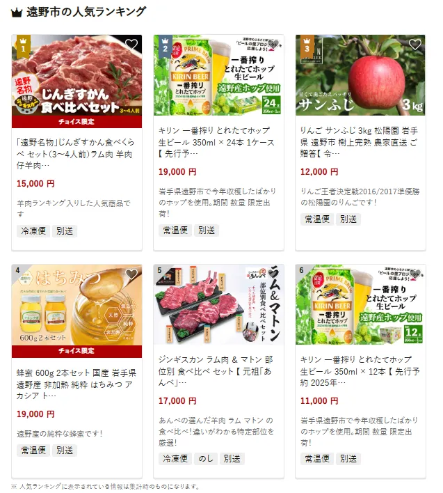 遠野市で人気の返礼品は「遠野名物 じんぎすかん食べくらべセット」です。柔らかく旨みのある羊肉を家庭で楽しめる定番の逸品です。他にも毎年数量限定で出荷される遠野産ホップを使用した「キリン一番搾り とれたてホップ生ビール」や全国大会で入賞歴のある高品質な「松陽園のサンふじりんご」が好評です。
