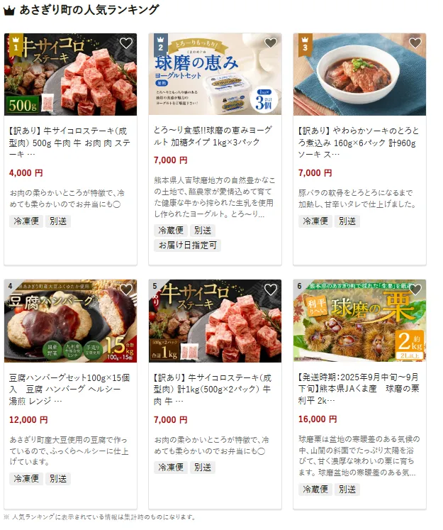 あさぎり町で人気の返礼品は柔らかくジューシーな牛サイコロステーキ(訳あり)です。冷めても柔らかく、お弁当にもぴったりと評判です。他にも球磨の恵みを活かしたとろ~り食感の加糖ヨーグルトや、豚バラの軟骨をとろとろに煮込んだ甘辛ソーキも人気です。