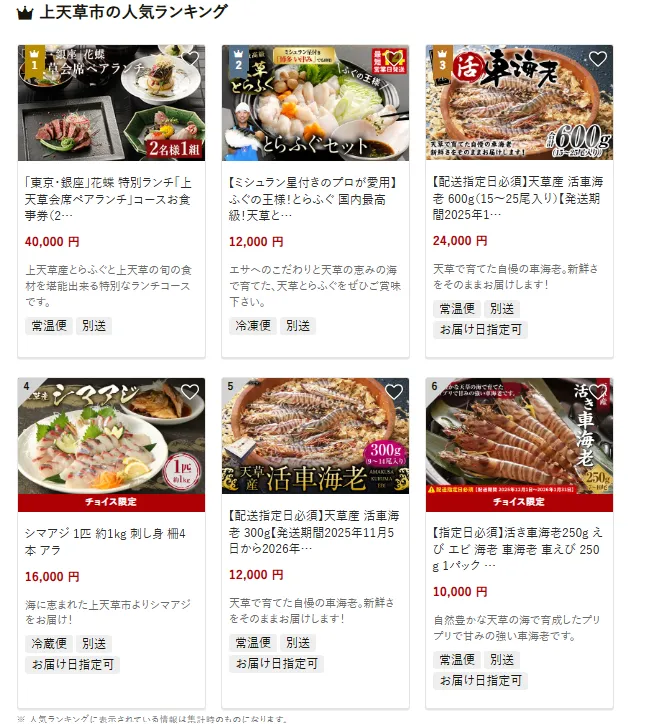 上天草市で人気の返礼品は東京・銀座の老舗料亭「花蝶」で味わえる地元産とらふぐや旬の食材を使った特別ランチペア券です。他にはミシュラン星付きのプロも愛用する天草とらふぐセットや、刺身で楽しめる鮮度抜群の天草産活車海老も人気です。