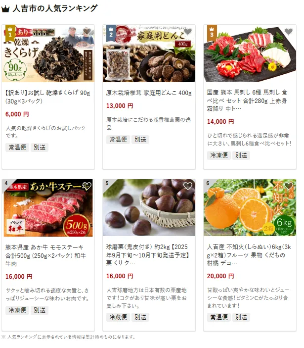 人吉市で人気の返礼品は手軽に楽しめる訳ありのお試し乾燥きくらげ90g(30g×3パック)です。他にも原木栽培にこだわった浅香椎茸園の家庭用どんこ椎茸400gや、馬刺し好きにはたまらない、熊本産の馬刺し6種食べ比べセット(合計280g)も好評です。