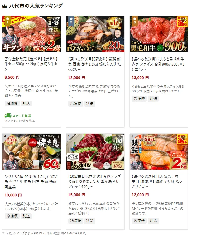 八代市で人気の返礼品は厚切り薄切りの牛タン食べ比べセット(500g〜2kg)です。TVでも紹介された話題の商品です。他にも料亭の味を自宅で楽しめる旬の鮮魚西京漬け(1.2kg・5種20枚セット)や、すき焼きなどにぴったりのくまもと黒毛和牛の赤身スライス(合計900g)も人気です。