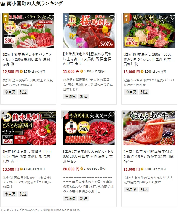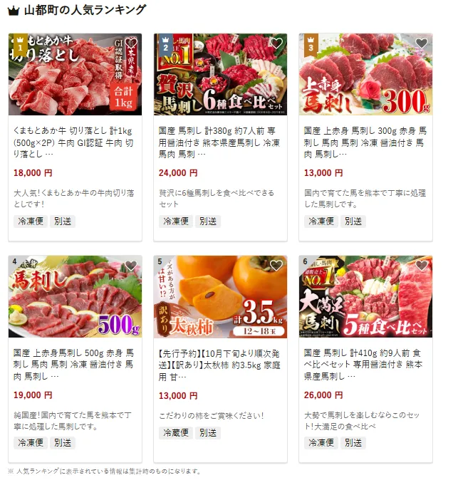 山都町で人気の返礼品は熊本県産のあか牛切り落とし肉1kg(500g×2パック)です。ジューシーな赤身肉を小分けで楽しめます。他にも贅沢な6種の馬刺し食べ比べセット(計380g)や、国内育成の馬を熊本で丁寧に処理した上赤身馬刺し300gも人気です。
